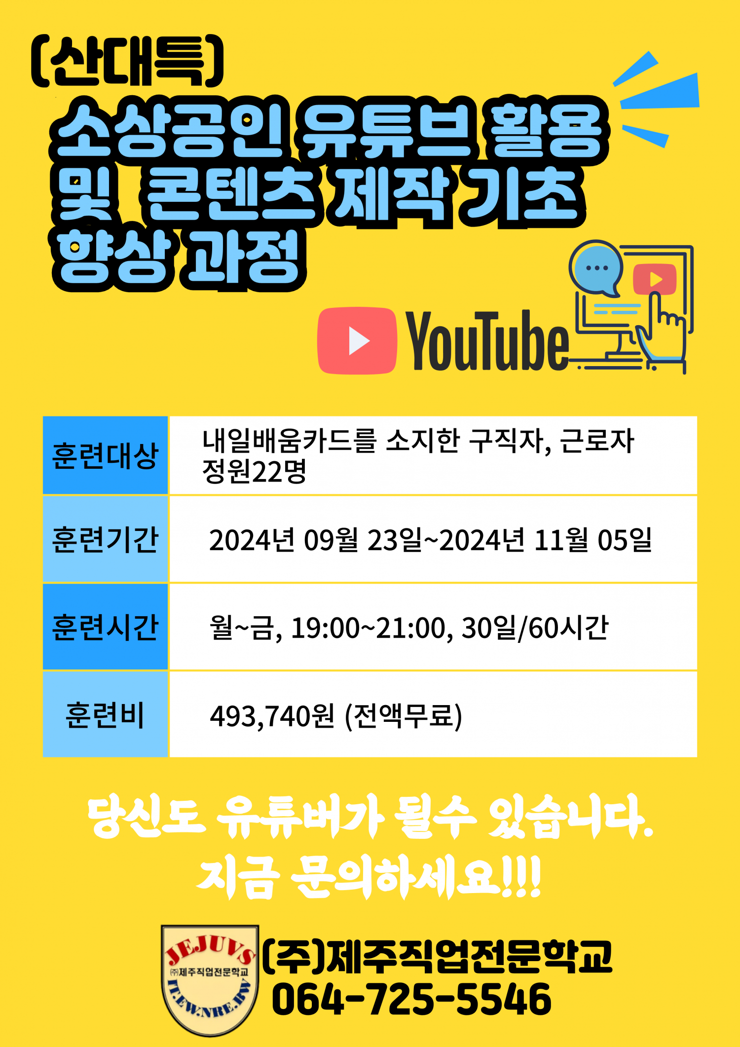 게시물 (산대특)소상공인 유튜브 활용 및 콘텐츠 제작 기초 향상 과정 2회차 안내